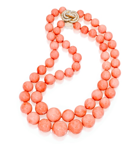 This necklace is really stunning in its simplicity. From Sotheby’s online catalogue for its upcoming February 6 auction (timed perfectly for Valentine’s Day): two strands of 58 coral beads graduating from approximately 21.3 to 10.6 mm, the clasp designed as a knot set with round diamonds weighing approximately 1.20 carats, length 13 inches.”