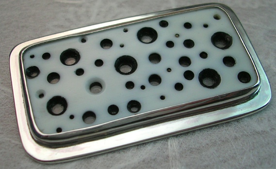 Pennie bored the key with small, irregular circles, and set it in a sterling silver bezel. She used India ink to highlight the interior of the circles, adding depth and bringing the dimension to the forefront.