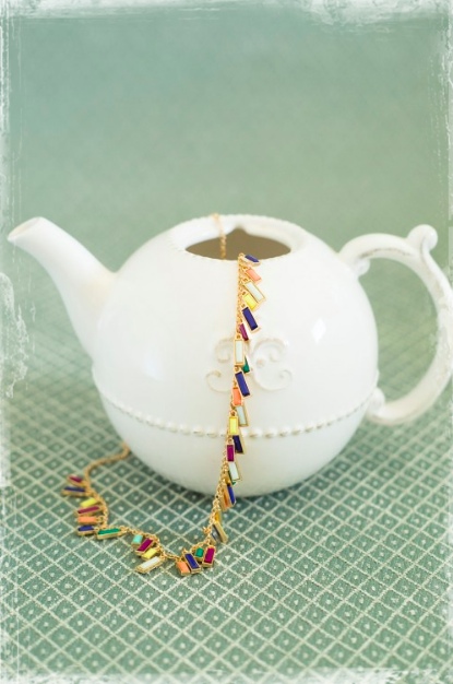 By Shabby Apple, this Penelope necklace is made of, well, other than the stated description of “colorful rectangular charms” (and they certainly are), I couldn’t tell you. But it’s only USD $50 so it’s the proverbial cheap and cheerful.