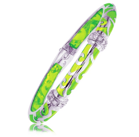 I lucked on a stack of these (on sale – even better) on a recent trip to New York. To know them is to want more of them. Made with sterling silver and translucent resin and accented with white topaz stones, these bangle bracelets by Angelique de Paris are chic and fun. And perfect for stacking and layering, either with more of the same or similar designs from Angelique. or with other bangles.