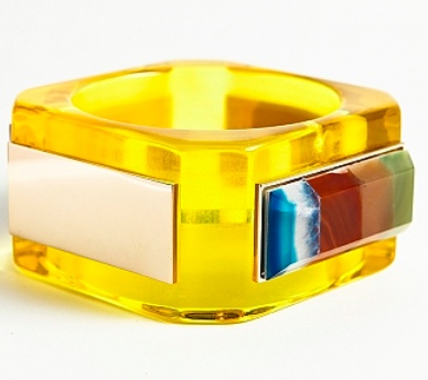Well, this is full of sunshine and sass. This fabulous cuff bracelet is are of resin and an agate mosaic set in brass. It’s designed by Valentina Brugnatelli, and sold by Mariana Antinori. Antinori recently opened a shop on New York’s Madison avenue (at 89th St.) showcasing the best of Italian design. Brugnatelli’s artist’s statement notes, “Valentina Brugnatelli believes a jewel needs to have a soul: an element that doesn’t relegate it to something decorative. It is essential it tells a story and triggers an emotion. She imagines her jewels worn by by a free-spirited woman with a personality strong enough to wear whatever she feels like. Someone you would turn to look at because there’s something about her that strikes you.”