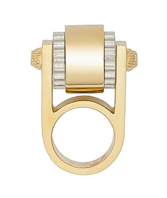 I love the bold, machine age look of this ring by Balenciaga. Its form is inspired by the house’s bags, with a focus on the hardware: central cylinder • nuts and small studs at side • Gold and palladium metal finishing. It’s made of tin and brass, though at first glance, I thought the white pieces on either side were crystals or rhinestones. I think I like it better for having no glitz at all.