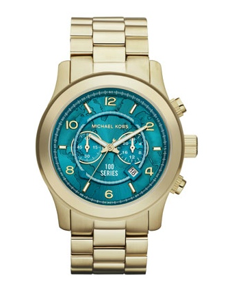 I believe this is the watch featured in Michael Kors‘s spring campaign, the Oversized 100 Series. My eye was caught by the swimming pool blue of the watch face; I like the contrast. When I looked for the watch on his web site, I discovered it has a charitable element. Each watch pays for 100 meals. As the site notes, “Michael Kors has joined forces with the United Nations World Food Programme (WFP) to fight global hunger. For every sale of the 100 Series watch, WFP will deliver 100 meals to children in need. The support so far has been overwhelming. Thanks to you, we have already delivered over 2 million meals around the world.”