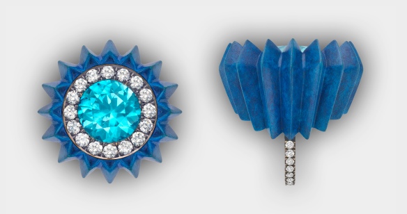 It took me a second to realize that the copper used in this ring by Lauren Adriana was likely the actual blue “bowl” (or caldera of its name). The other elements are gold, zircon and diamonds.