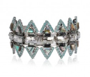 This pretty cuff bracelet by Elizabeth Cole is made with a mix of vintage crystals and new Swarovski stones. They are set in 24k gold plated brass. It’s a c-ring setting, so, open at the back. Available from Fragments for USD $365.