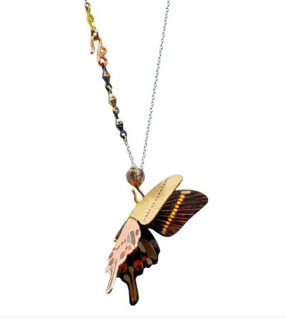 It is made of platinum, 18K yellow gold, 14K rose gold, shakudo, shibuichi, brass, copper and rubies, suspended on an 18K chain. Shakudo is a gold/copper allow, composed of 4–10% gold and 96–90% copper; it can be lacquered to present a blue patina. Shibuichi is an alloy of one part silver to three parts copper which presents a silvery gray patina when treated. I love the colours, the delicacy and the movement of this piece.