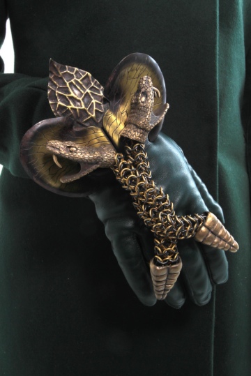 When Michael Jackson debuted his rhinestone encrusted single glove, people were all ooh, ahh. Well, that’s because they hadn’t yet seen this bronze, copper, brass and leather snake glove by Leah Aripotch. No one is going to jostle you on a crowded subway if you’re strap hanging with this on. Or, likely, anywhere else.