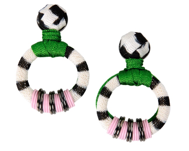 Knitted fabric is certainly what comes to mind when thinking of Missoni, who use an almost bargello-like technique for their highly recognizable designs. I did not realize that they use knitted fabrics for complementary jewellery as well, but here you have these earrings as proof.