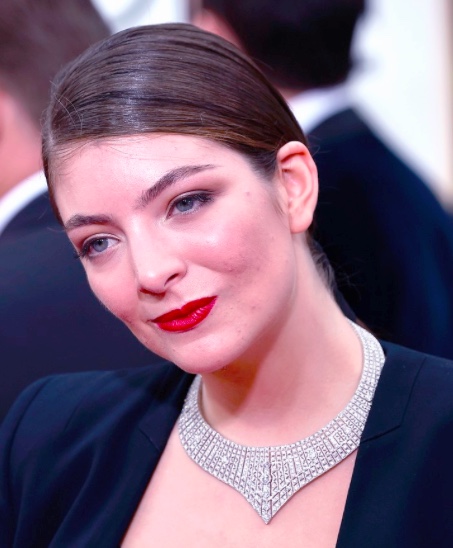 Amazingly, Lorde did not decide that all she needed was her signature purple lipstick (and she even changed that up for a glam red shade). She went with a stunning diamond collar loaned by Neil Lane. Thank you, Lord. And Lorde.
