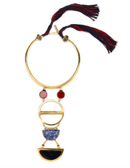 By Lizzie Fortunato, it is gold-plated brass she describes as a “collar necklace with carnelian beads, ‘scissor’ pendant, blue willow semi-precious cabochon and enamel detail.” I also enjoy the fact that the URL to this piece is titled “Bohemian glamour necklace.”