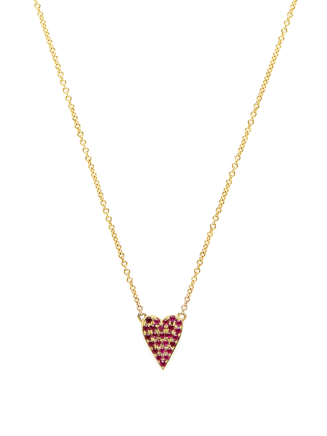 Net proceeds from each purchase shall be no less than approximately 40%-50% of the purchase price, and will go to the Global Fund in support of (RED). 18K yellow gold heart pendant necklace with .12 ct pave ruby details.”