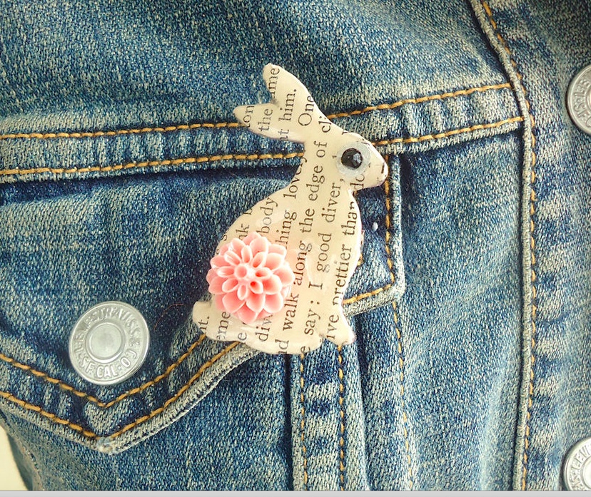 I think it’s safe to say that anyone in snowy climes is pretty much desperate for spring weather and some warmth at this point. I know I am. This pretty little brooch is very springlike; a resin hare with a tiny acrylic flower “tail” and Swarovski crystal “eye”.