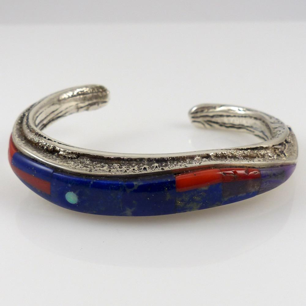 This bracelet is sterling silver with an mosaic inlaid Mediterranean coral and lapis with an offset black Brazilian opal dot representing Jupiter. It was made by Jemez designer Phil Loretto, and sells for USD $650 from Garlands Jewelry.