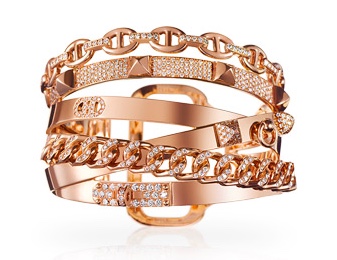 I do love a lot of Hermes jewelry but I’d be lying if I said I thought it was worth what they charge for it. This bracelet is a case in point. It’s a mishmash of a bunch of Hermes design elements, including the chaine d’ancre chain, the Medor stud, and the Kelly and Birkin straps and turnlock. They’ve been jumbled together and rendered in 18k rose gold and with a diamond carat weight of 4.71 in total, and will set you back USD $130,200.