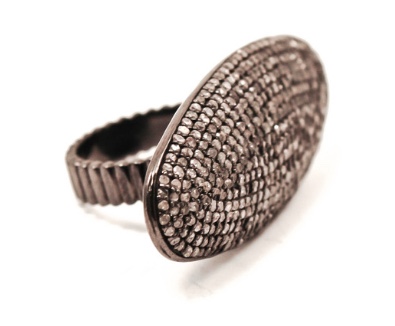 From Alixandra Collections comes this eponymous ring, set with diamonds in … mystery metal. That’s right, it isn’t specified on the web site. Nor is the total diamond weight. The site notes merely, Pave Diamond Horizontal Oval Ring; Art Deco Backing with Ribbed Ring Base; Size 8.”