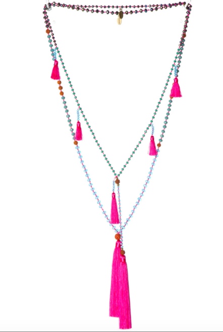 I’m having a tassel week, it seems. This necklace, with it’s cheerful hot pink tassels, looks like a party. By Zacasha, it works with traditional Balinese tassels. The site explains,Once upon a time on the mystical island of Bali, the Zacasha collection was born …