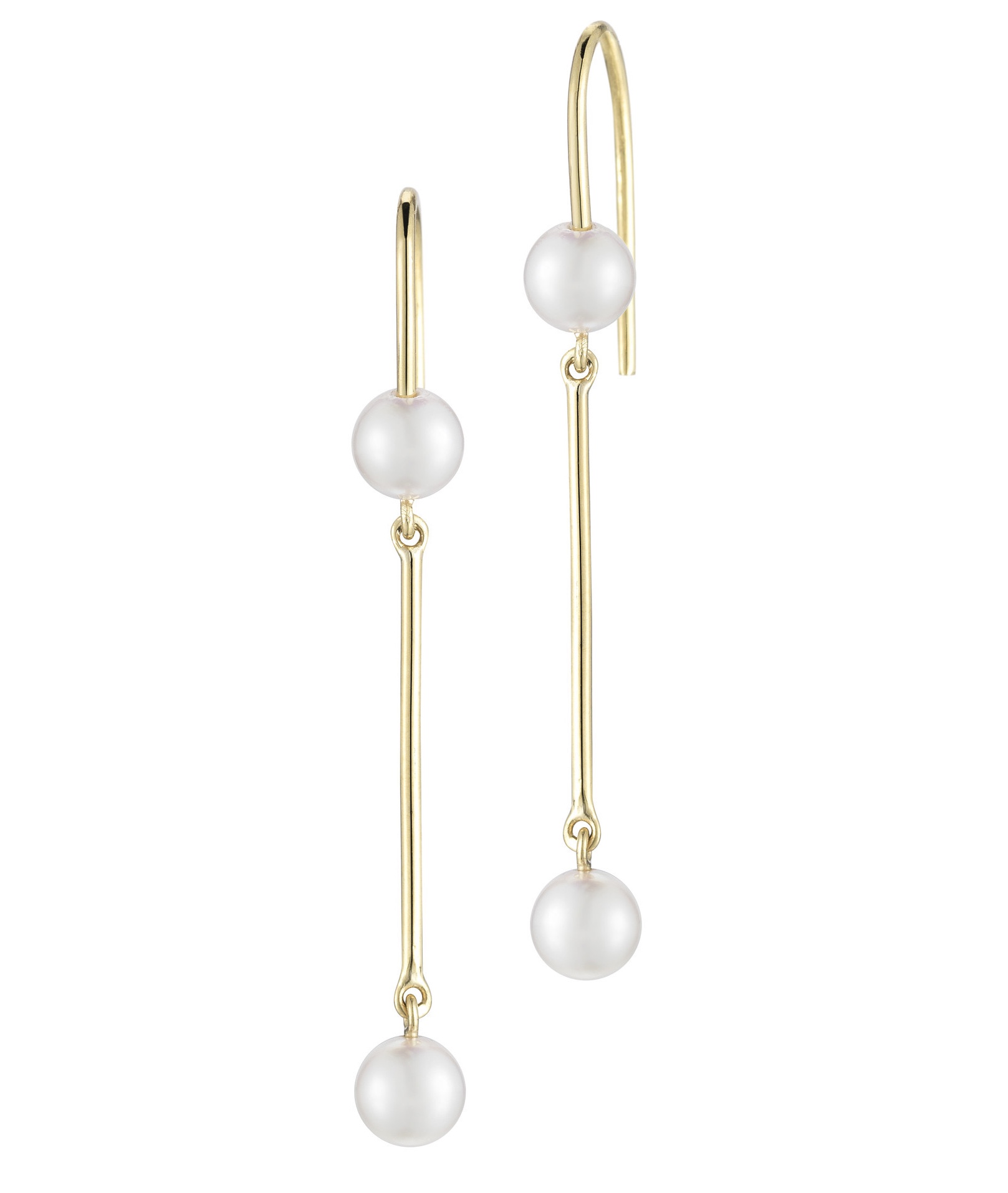They offer a number of different collections and their pearls are simple and elegant. They are also affordable. Finn’s Akoya Pearl Bar earrings bring a little something more to what can be a staid conservative gem stone. These are 18k yellow gold with Akoya pearls on each; size isn’t noted but I’m guessing 7 or 8 mm pearls. They sell for USD$550.