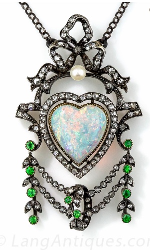 Seller Lang Antiques explains, “Late-Victorian/early-Edwardian romance and refinement emanate from this exquisite fin de siècle jewel, highlighting a splendid, multi-chromatic, heart-shaped opal secured in a golden bezel setting framed by glittering rose-cut diamonds set in darkened silver over gold. The enchanting gemstone is crowned by a classic natural pearl-centered bow motif and surmounts an articulated double garland further enlivened by bright lime-green demantoid garnets. Possibly French, English or Russian, although no hallmarks are extant. This rare and breathtaking jewel measures just shy of inches high by 1 and 1/8 inches wide and suspends from what appears to be its original 16-inch silver chain.”