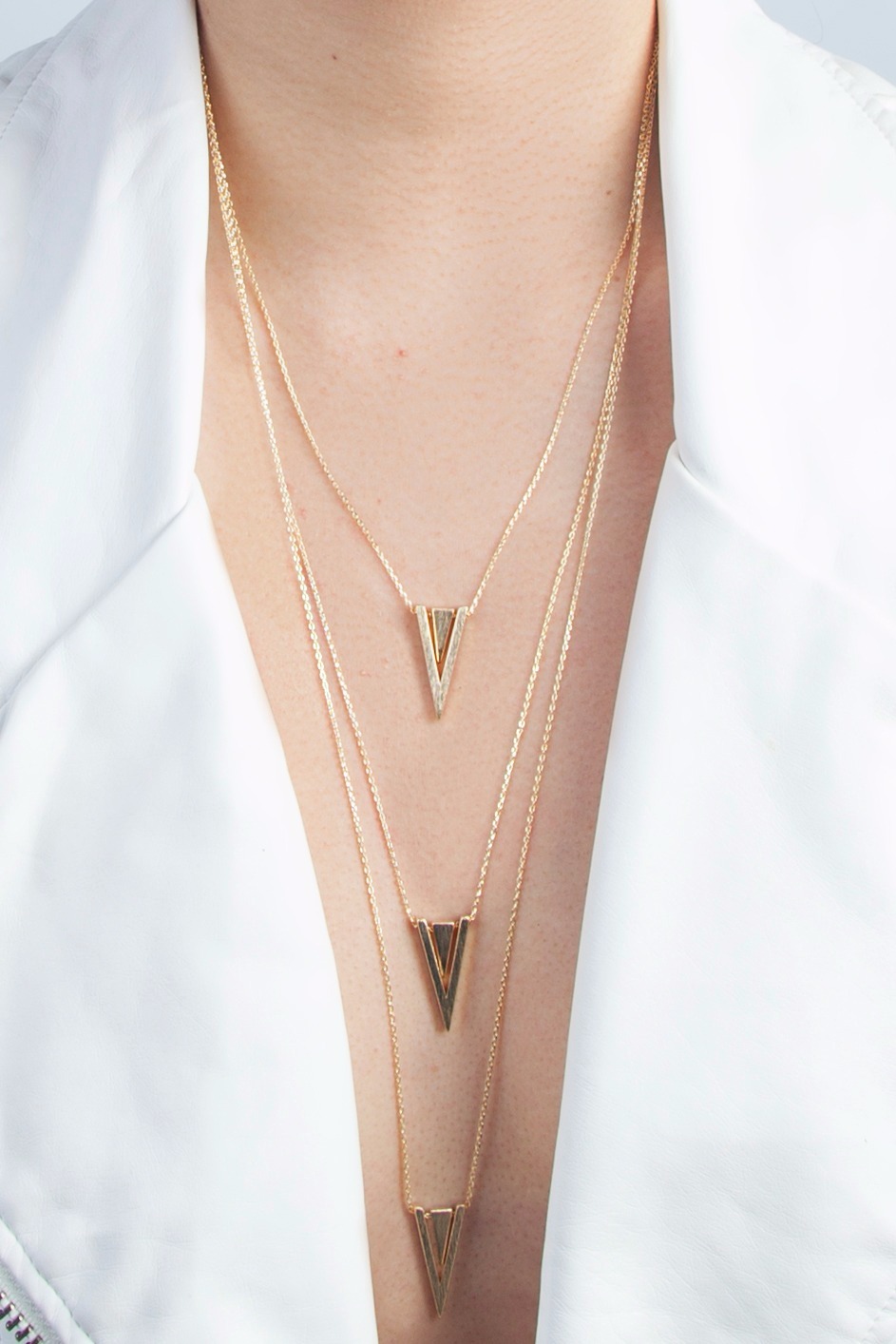 From the large and in charge statement necklaces, the style pendulum has swung over to minimal and sleek. Sort of, if you don’t count the layering trend that snuck in. This necklace by RueGembon makes it easy for you, with three attached chevron pendants. Voila! Instant layers.