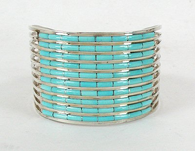 This beautiful spreadwire turquoise and sterling silver cuff is by Anson and Letitia Wallace. This one-of-a-kind cuff has a total inside circumference and approximate wrist size of 6-1/2 inches and approximate wrist size, including the opening gap of 1-1/4 inches with a total inside circumference of 6 1/2 inches.