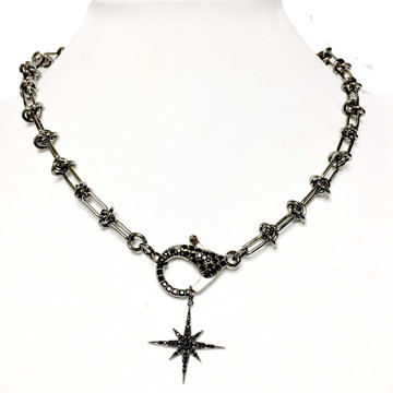 Chokers show no sign of flattening out as a trend, and this one has a tiny twist: a barbed wire design. By Love, Lisa, it is 6″ with a gunmetal lobster clasp closure set with black stones. The charm shown must be purchased separately (but it does look very cool with this piece). The necklace alone sells for USD$74.