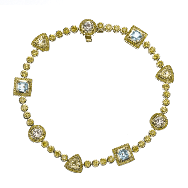 This is not your average tennis bracelet. By Crow’s Nest, it features individually cut stones (kunzite, topaz, sapphire) on a yellow diamond studded chain. Pretty!