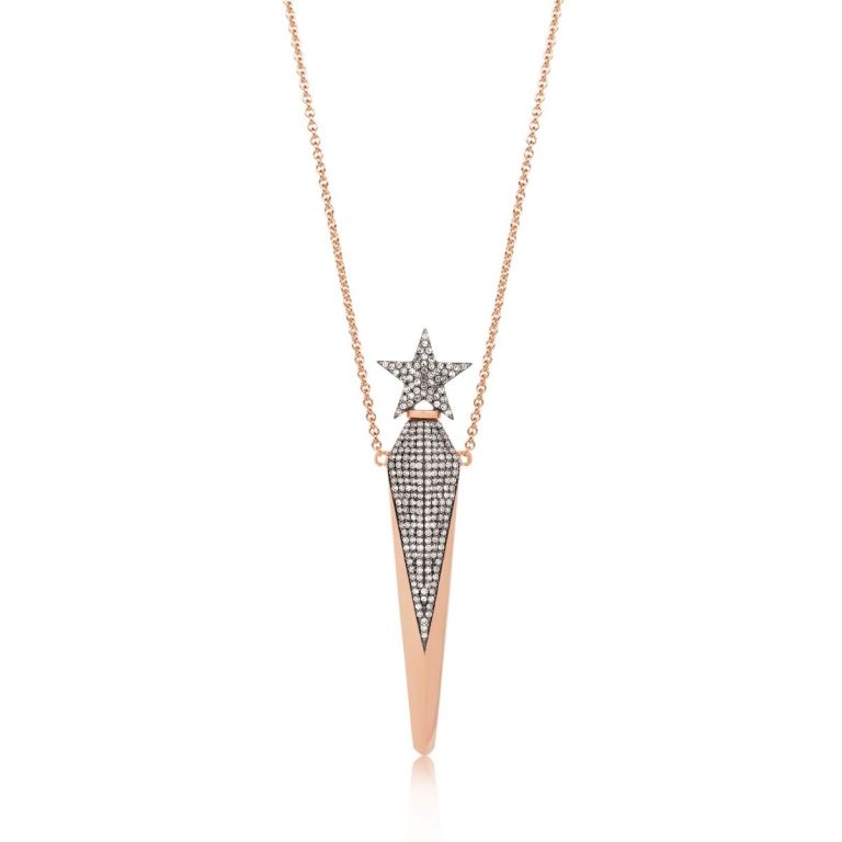 This diamond pave necklace by Diane Kordas is exclusive to Stone and Strand. This pendant is set with .35 carats of diamonds in 18k gold. Although it’s pictured on a chain, the site doesn’t mention if that is included.