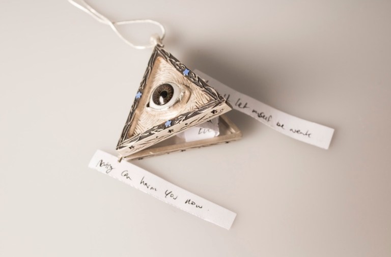 2017 graduate Olivia Wong created this as one of three pieces for her thesis project, titled I Am, You Are, and is in her words part of, “a series of three objects. By researching how objects are able to create social meaning, these objects create a discussion and dialogue about the issues of sexual assault. These objects carry dualities that are discovered when worn or used. These dualities include targeting/watching, manipulation and comfort/discomfort.”
