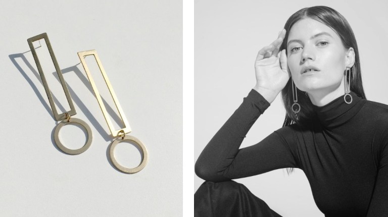 These spare looking earrings by Modern Weaving really punch up a plain outfit, as seen in their model photo. Made in brass with sterling silver posts, these measure three inches long. They sell for USD$120.