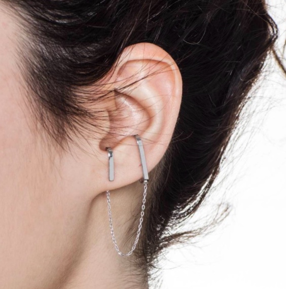 This fun linear ear cuff is sold as a single, so you can be as creative as you want with the other ear, or other ear piercings you may have. By Astrid and Miyu, they note, “The fine line ear cuff is an on-trend piece. The unusual structure and simplicity of this piece makes it both very cool and very wearable. The ear cuff, crafted from sterling silver, has two elements: a stud and a cuff that can be placed higher up the ear. The high-shine finish makes it look especially striking. The fine line collection is a fusion of geometry and softer lines. It has been inspired by minimal architecture, painting and structures. This collection is designed to celebrate the interaction between our bodies and our accessories, which was done by studying the contrast of fluidity between chains and solid lines. The sterling silver ear cuff is beautifully made and should be worn with hair swept back to show it off to the full effect. Mimic its shiny finish with wet look hair styled into a bun or a messy ponytail. Simple make-up will add to a minimalistic look.”