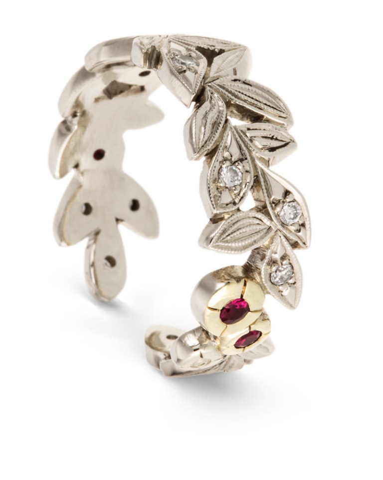 Salome Jewellery takes the names for a lot of their pieces from Greek and Roman mythology. Herewith, the Nike ring. Crafted of white and yellow 14k gold, it is accented with rubies and diamonds. This would make a perfect wedding or simple band for daily wear.