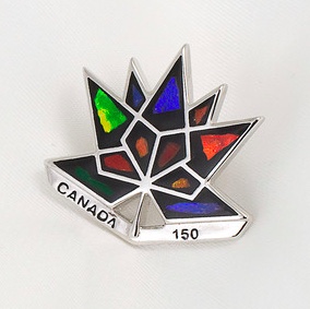 Happy 150th birthday, Canada! You’re looking good for being such a grande dame. It wouldn’t be a proper birthday without a piece of commemorative jewelry and Korite is one of he firms selected by the Government of Canada to produce pieces. This pin shows the official maple leaf logo developed for the occasion, set with ammolite, a rare stone found in Canada. The ammolite stone comes from the aragonite shell material found on two species of extinct ammonite fossils (Placenticeras meeki and Placenticeras intercalare).