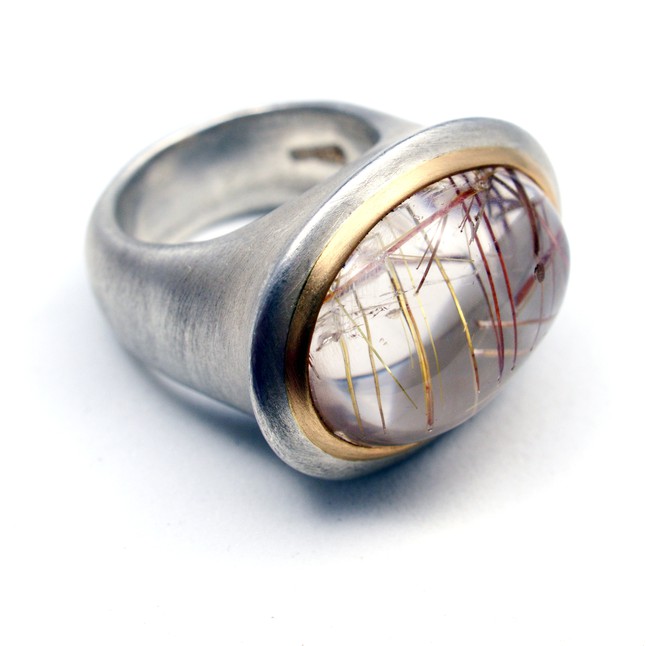 This ring is described this way: “Part of Alejandro’s original Rock Candy series, this rutilated quartz ring features a clear crystal with pine needle rutiles, measuring at 22mm x 17mm x 8.3mm. Set in 18k gold and cast in britannia silver, the satin finish gives the ring a wonderfully smooth, matte surface.”