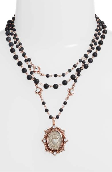 This layered necklace by Virgins, Saints and Angels is “a Swarovski crystal-embellished medallion sparkles on a delicate necklace handcrafted in San Miguel de Allende, Mexico, with layered strands of rosary beads.”