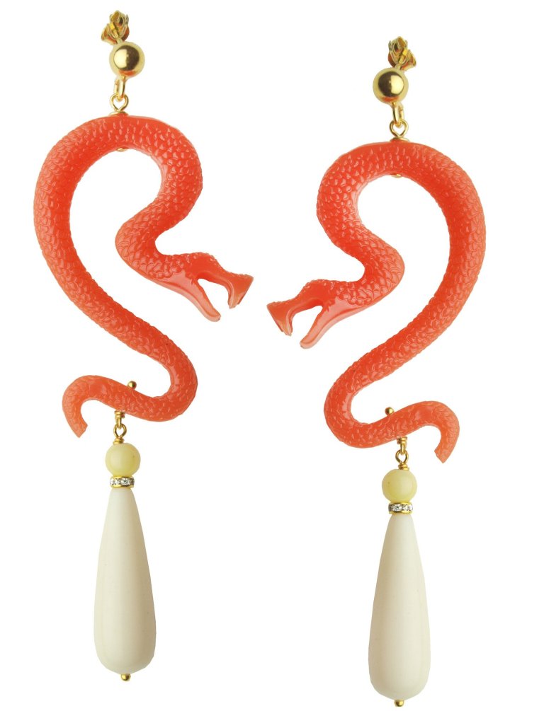 These earrings are,”carved resin coral snakes. Their lower part carries a white coral paste drop and yellow agate bead. Crystals set in gold-plated metal add an extra sparkle. The hooks are gold-plated 925 sterling silver. They offer the definite accessory for an impressive appearance. The pair is delivered in a satin pouch within our branded paper box.”
