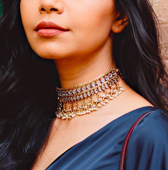 If you’re going to succumb to the choker trend, you may as well do it with some regal intent. This piece by Indian designer Blossom Box has a bit of a Mughal twist to its design: it’s gold plated with faux pearls and crystals, and is a one size fits all piece with an adjustable chain.