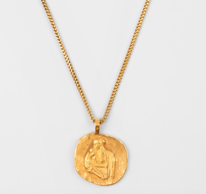 They describe this piece as, “Madonna and Child” Medallion Necklace, 18K yellow gold, large size. colette welcomes the collaboration between Jacob Arabov and Kanye West. The 18K gold collection draws from 14th century Florentine art such as Donatello’s base-relief portraits, and evoke a certain classical romance.”