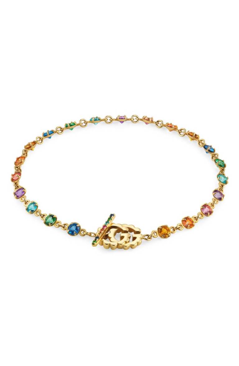 I’ve never been a huge fan of logo’d jewelry, but as these things go, this bracelet by Gucci is pretty. It does have the ubiquitous interlocking G logo clasp, but it also has a rainbow of semiprecious stones. Set in 18k gold are sapphire, topaz, tsavorite, golden citrine quartz and mother-of-pearl.