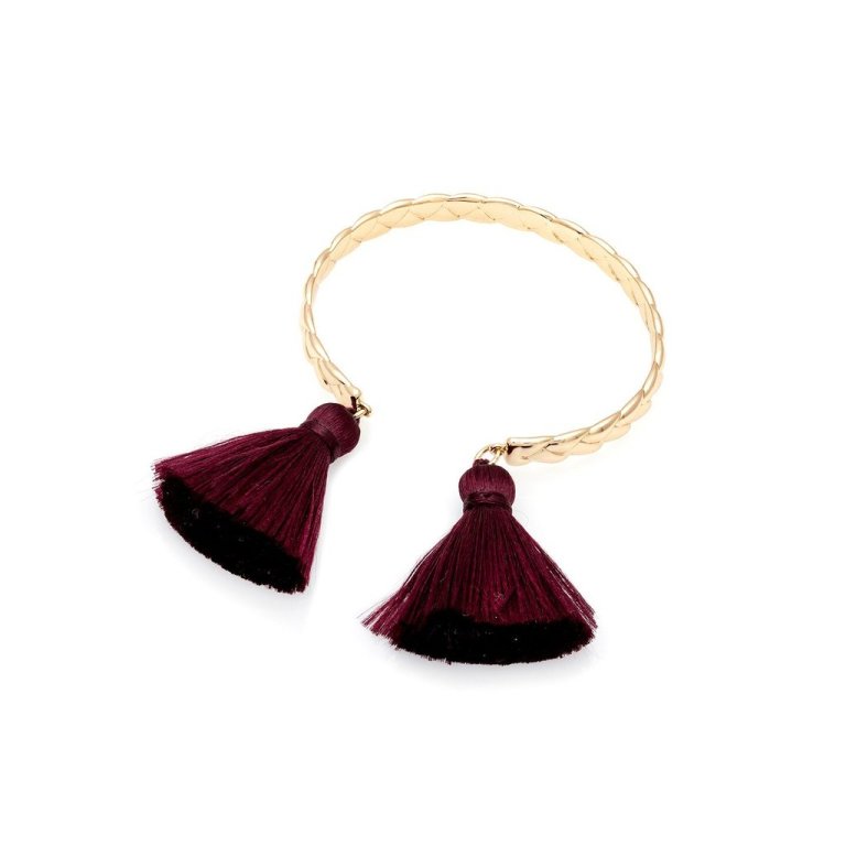 This is a fun, easy to wear bracelet that lends itself well to stacking or being worn on its own, with the fabric tassels the star of the show. By Melanie Auld, it is gold plating over brass adorned with tassels; they come in other colours as well. This version in wine is part of Auld’s fall 2017 collection.
