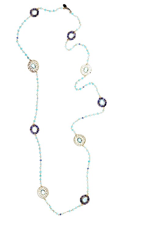 This necklace, whose sister piece I saw in person on the weekend, is made of pink opals and and sapphire stations with blue topaz. It can easily be worn doubled for more versatility (worn as a single strand it measures 40 inches).