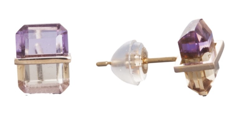 If you’re tired of plain old, plain old stud earrings, these pretty pieces by Januka offer a little something different. Made of ametrine set in 10 yellow gold, the colour gradation provides some extra visual interest.