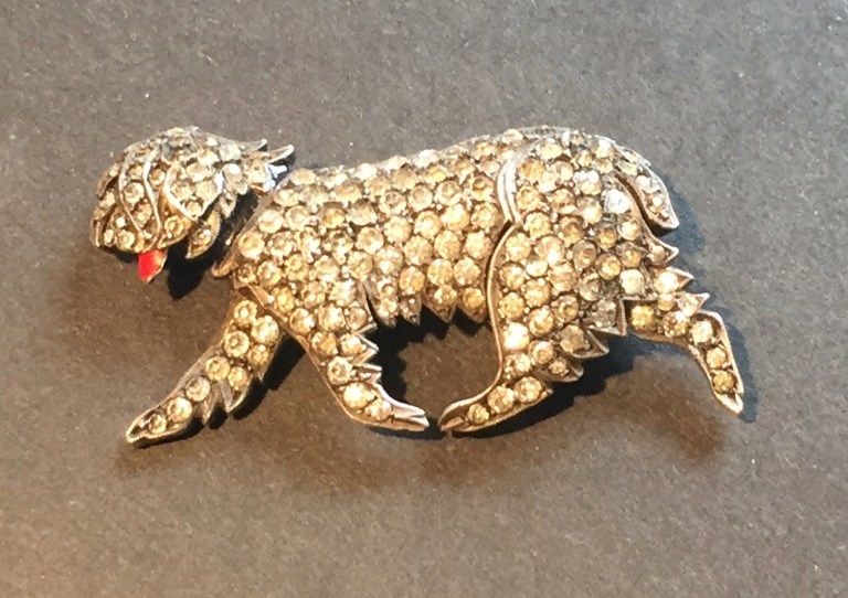 My favourite feature is the tiny enamelled red tongue. It’s made of 935 silver and has (I think) the mark JOF; I haven’t been able to find to whom that might belong but 935 was typically German or Austrian. The pin is small but mighty and looks just like my Wheaten Terrier.