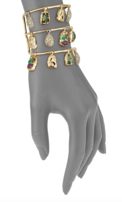 It features charms on three rows, set with crystals and semi-precious stones. This cuff has an open back so you just slip it on your wrist. It sells for USD$425. Jingle jangle!