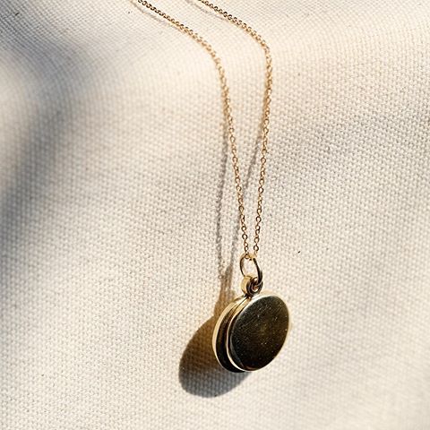 This plain gold round locket by Amarilo is made to order in Los Angeles. Their site notes it has a 14k chain but doesn’t specify the metal content of the locket itself. This sells for USD$500.