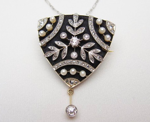 Another Edwardian piece, but I don’t think you can really have too many from this era. A rather unusual shield shape is set with diamonds and seed pearls. Pike Place, Seattle seller Isadora’s Antique Jewelry describes it as, “Circa 1900. This stunning platinum and 18KT gold necklace features an array of old European-cut, single-cut, and rose-cuts diamonds weighing approximately .80 carats total, accented with seed pearls and set against a black satin background. The pendant, nestled in its original box, is suspended from a platinum fancy link chain, and can also be worn as a brooch.”