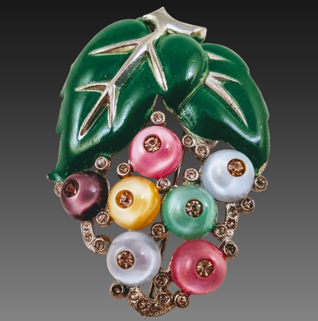 When I first saw this, I thought it might be a dress clip, but it’s a brooch. Even better, as pins are more versatile. Made in the 1930s, it’s cold painted enamel set with tiny rhinestones. Seller Retro Jewels explains, ”