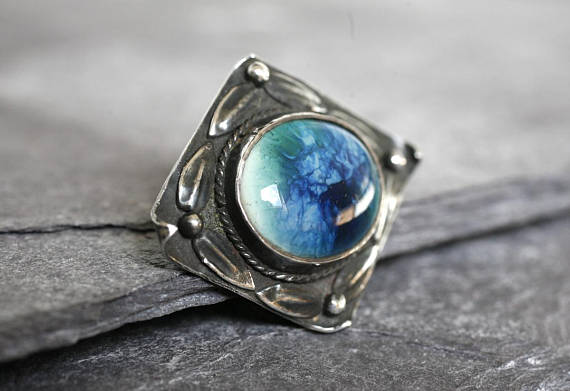 John Ruskin was one of the founding fathers of the Arts and Crafts movement in Britain in the mid 1800s. When the Ruskin Pottery was founded in 1898 the owner, Edward Richard Taylor, named it after Ruskin in recognition of his philosophy. The pottery began making the small cabochons or ‘enamels’ in the early 1900s and they became very popular, being used for simple home made jewellery, as well as for more expensive pieces by high end silversmiths, including work for Liberty of London. Other potteries did make similar plaques in the 1920s and 30s but When the the Ruskin Pottery closed in 1935 the secret behind the specific glazes was destroyed so the work could not be replicated.