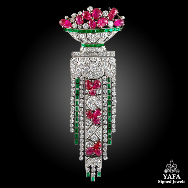 This is the kind of piece that makes me question why my family didn’t invent something that made us fabulously wealthy. Because if they had, I am sure my jewelry box would have been overflowing with pieces like this Art Deco jardiniere pin offered by Yafa. There isn’t much information about it on their site, other than the stone content and setting (platinum), and that you should call for the price. Think kindly of my uninventive family when you do.