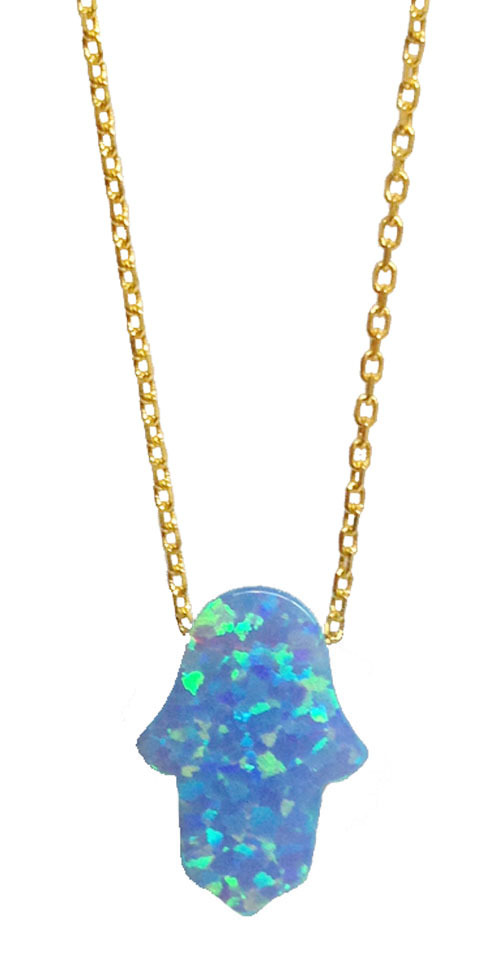 This pendant by Jewels by Durrani has a gold plated sterling silver chain, though no detail is given about the material of the hamsa itself. It looks like reconstituted opal, but may be … anything opal-like.