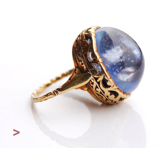 This sapphire ring, offered by Etsy seller Atelier de Montplaisir, is quite the looker. The single stone weighs in at a hefty 23 carats, cut in a cabochon style. It is in an 18k yellow gold setting the seller dates to the mid-eighteenth or early nineteenth century, though it is not hallmarked. It is currently a size 4.75.